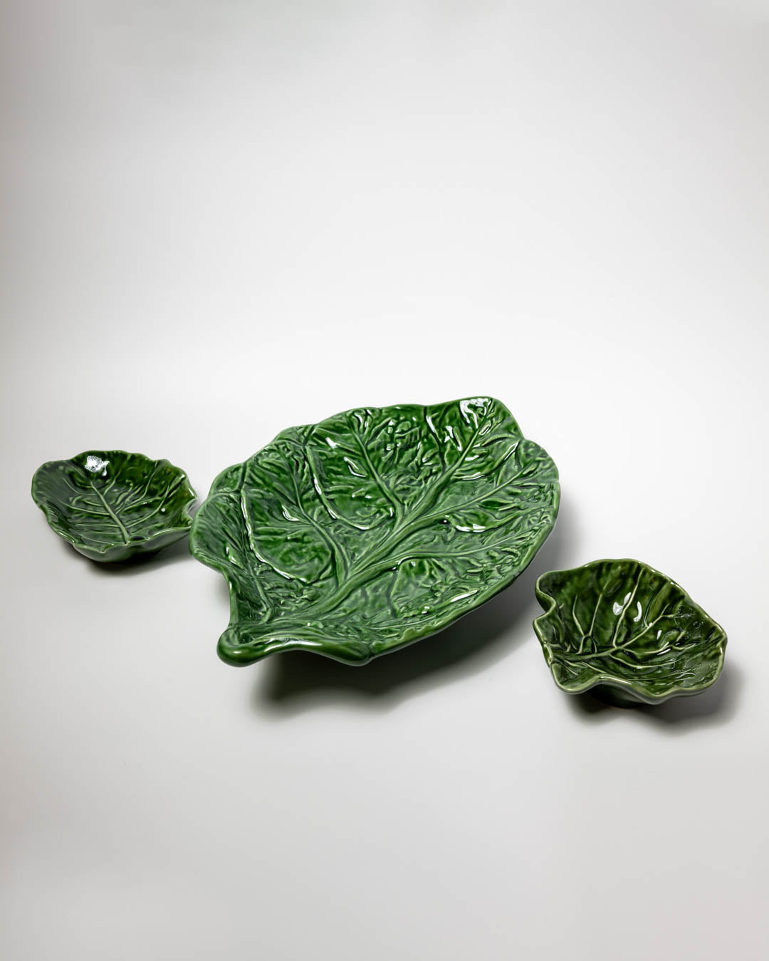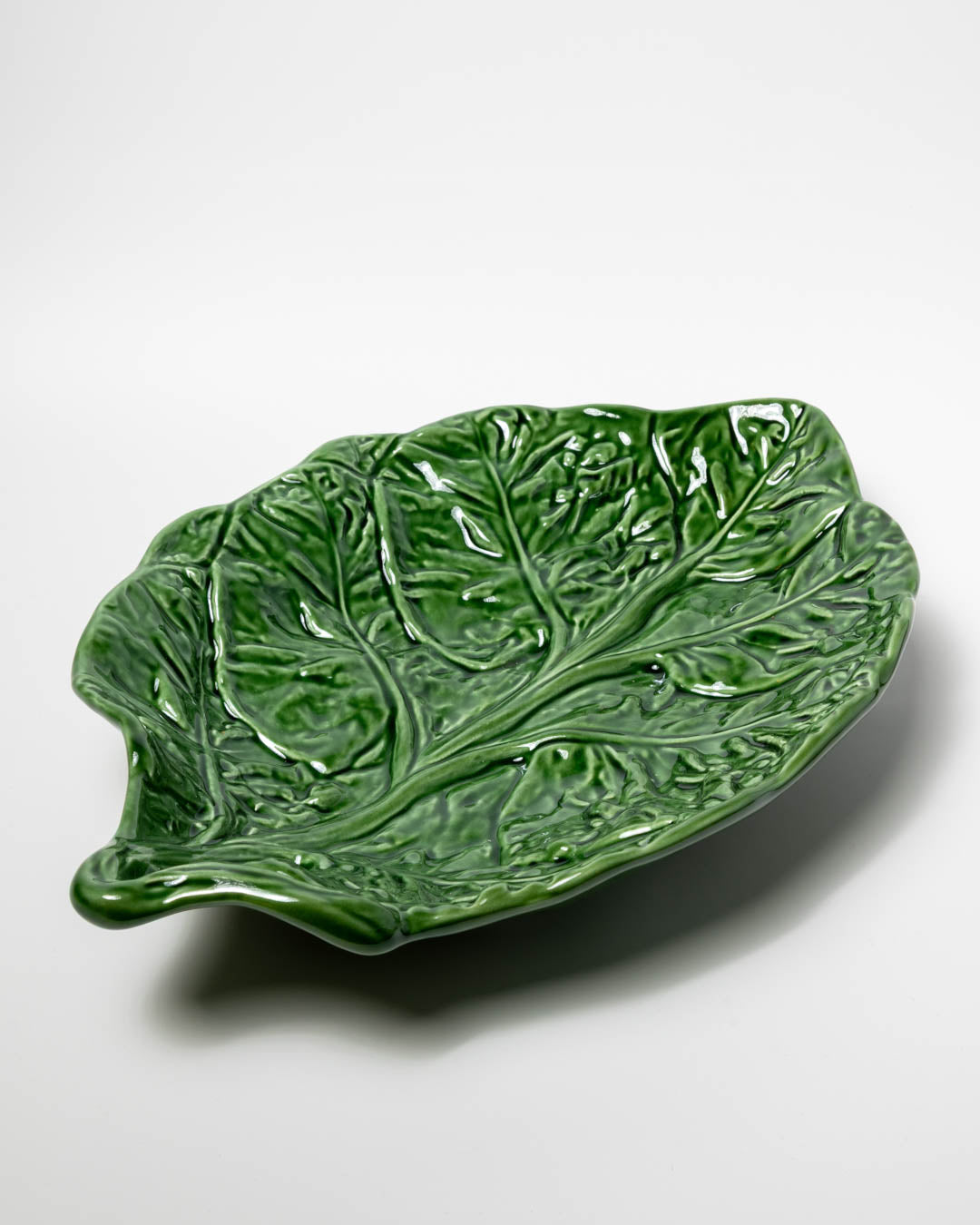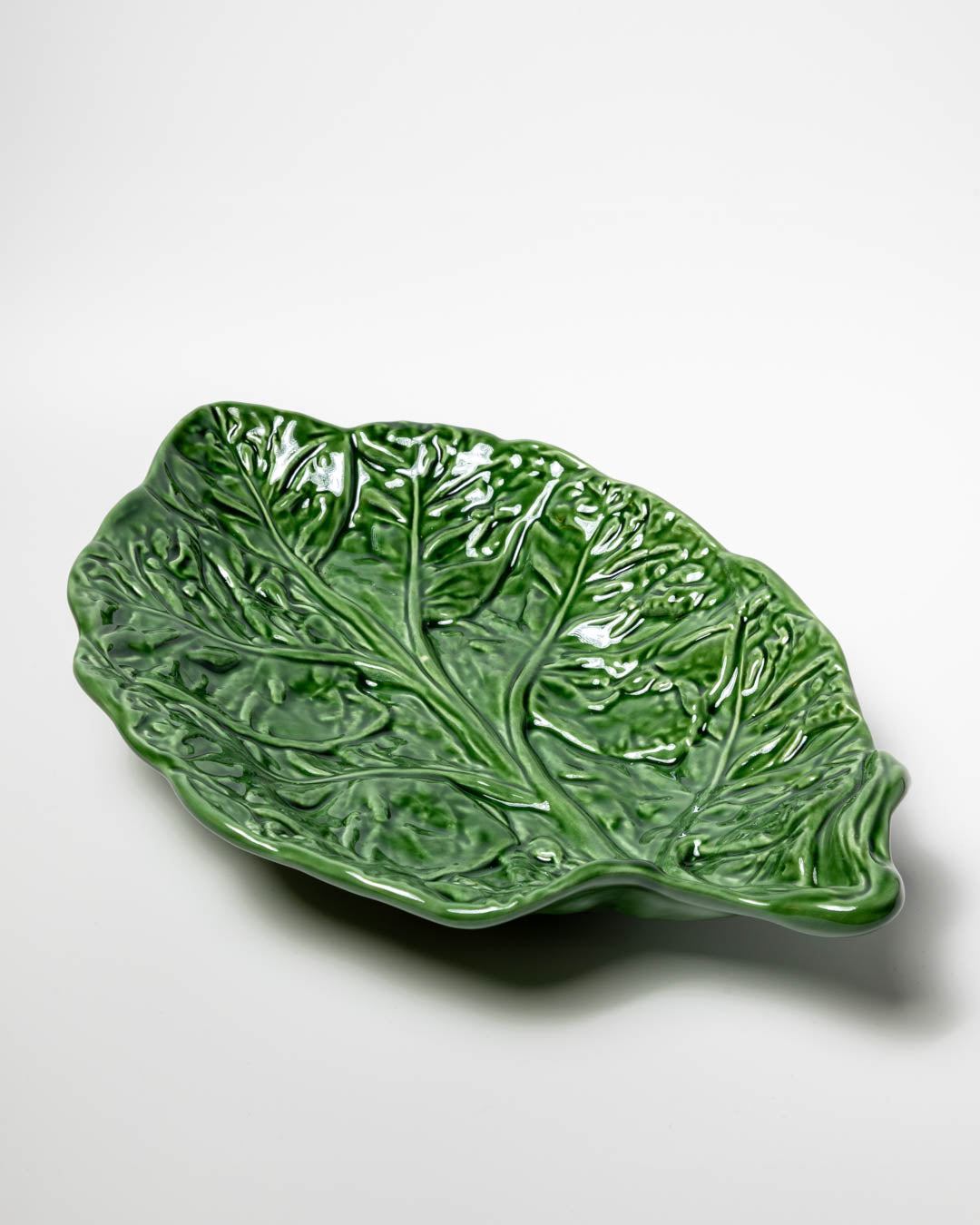 Dette keramiske serveringsfad er formet og færdiggjort i hånden i Portugal og afspejler en gennemtænkt tilgang til både funktion og dekoration. Kunsthåndværkerens sans for detaljen ses i den subtile udformning af bladårer og organiske konturer, som fremhæves yderligere af en dyb grøn glasur, der minder om kålbladets naturlige skønhed.