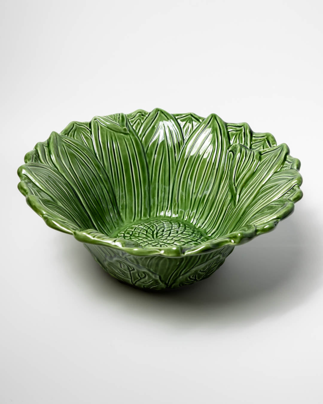 Denne salatskål er håndlavet og håndmalet i Portugal og formet i keramik med omhu for at gengive formen og strukturen fra en solsikke i fuldt flor. De diskrete reliefdetaljer og den dybe grønne glasur skaber et levende, men afdæmpet udtryk, som egner sig både til festlige lejligheder og til daglig brug.
