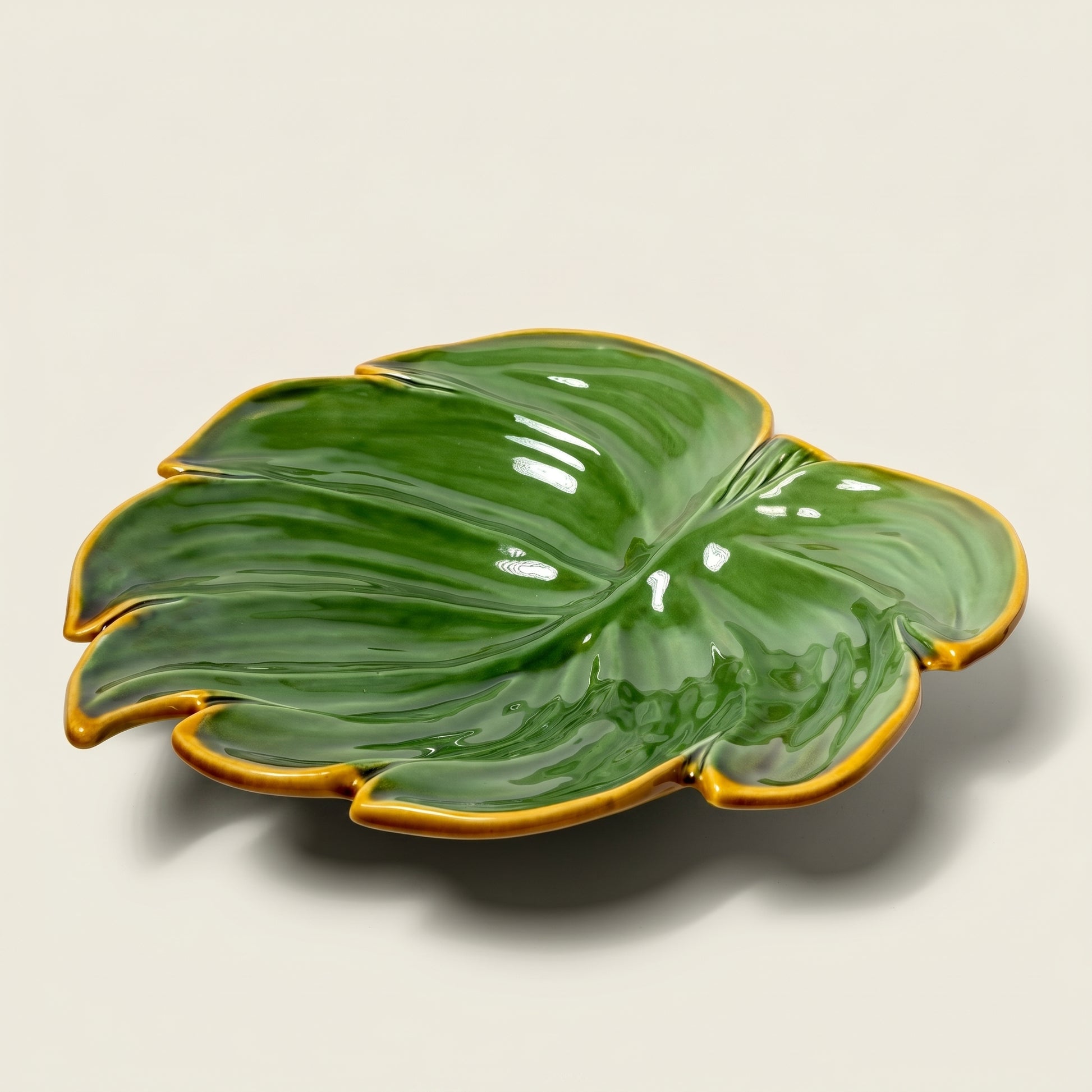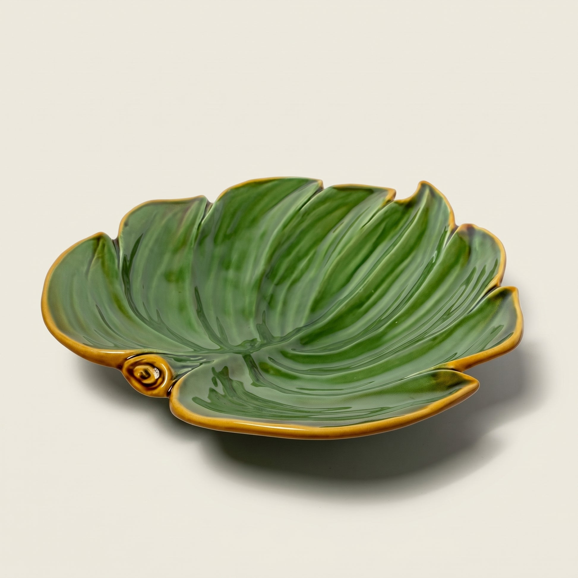 Dette keramiske serveringsfad er håndlavet og håndmalet i Portugal, skabt med omhu af dygtige håndværkere. Formen er inspireret af et tropisk blad og giver en naturlig og indbydende tilstedeværelse i dit spise- eller opholdsrum.